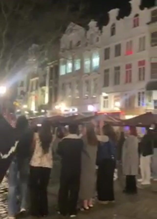 nighttime street scene in what appears to be a European town. A group of people is gathered, watching a saxophonist playing in the middle of the square. The buildings surrounding the square are multi-storied and have distinctive architectural details. There are outdoor seating areas with umbrellas set up, suggesting restaurants or cafes. Streetlights illuminate the scene. The ground is paved with cobblestones. People are dressed in casual attire. Some are holding up phones, likely recording the performance. Overall, the atmosphere seems lively and social.