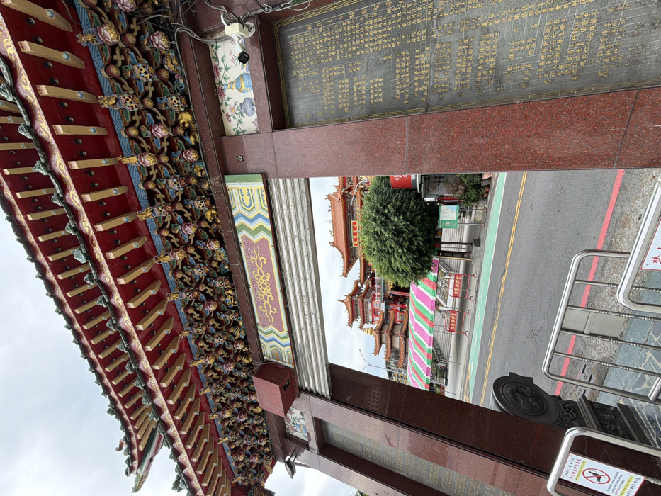 Elaborate temple entrance featuring intricate, colorful wooden carvings on a red roof. A granite wall with inscribed text stands beside the opening, offering a glimpse into a temple complex across the street. Buildings with layered roofs, a round tree, and colorful banners decorate the scene. The angle is slightly tilted, capturing an architectural blend of ornate traditional design and practical urban elements.
