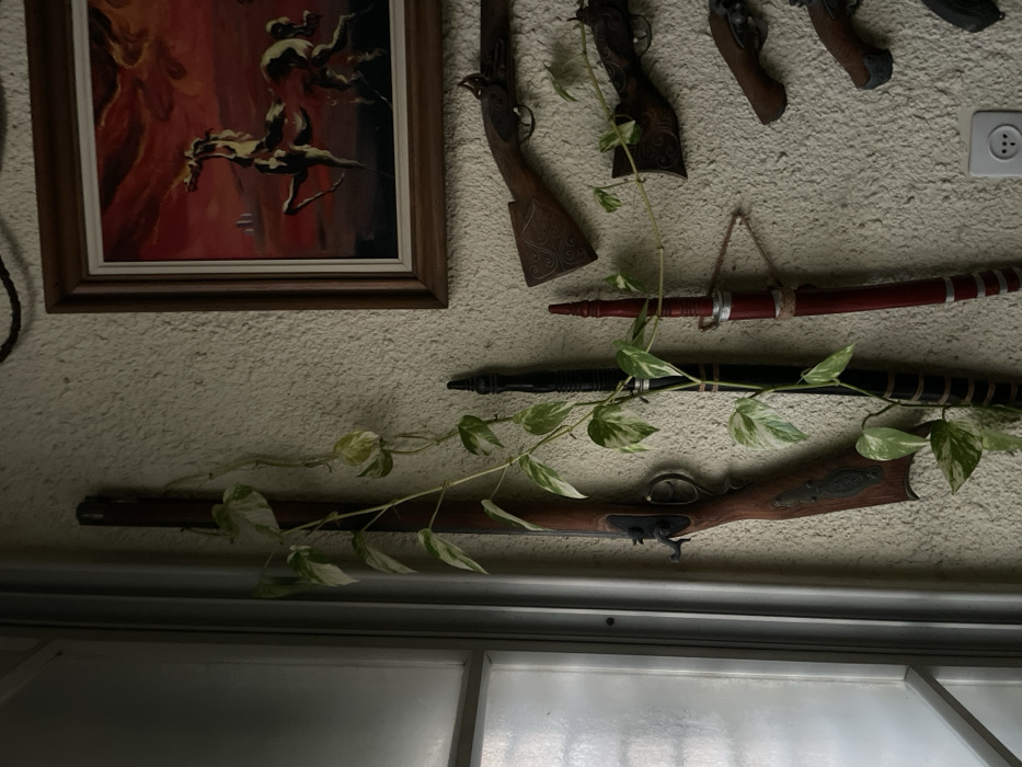 An interior wall in Petah Tikva, Israel, displays an assortment of decorative objects. The wall itself is light-colored with a pronounced stucco texture. To the far left, a white window frame allows natural light to enter. A variegated plant, likely Pothos, with green and cream-colored leaves, trails vertically from the upper left, intertwining with the displayed items. Mounted vertically on the wall are a long, dark-wood rifle, resembling an antique flintlock, and two slender, staff-like objects—one black with light bands and one dark red with silver bands and a cord. Above these, a rectangular framed painting features a vivid red and orange sky with stylized, running horses. Below the painting and to the right, multiple antique-style pistols with wooden stocks and dark metal components are horizontally affixed to the wall. In the lower right quadrant, a white, circular electrical outlet with three circular pins is visible on the textured wall. No individuals are present.