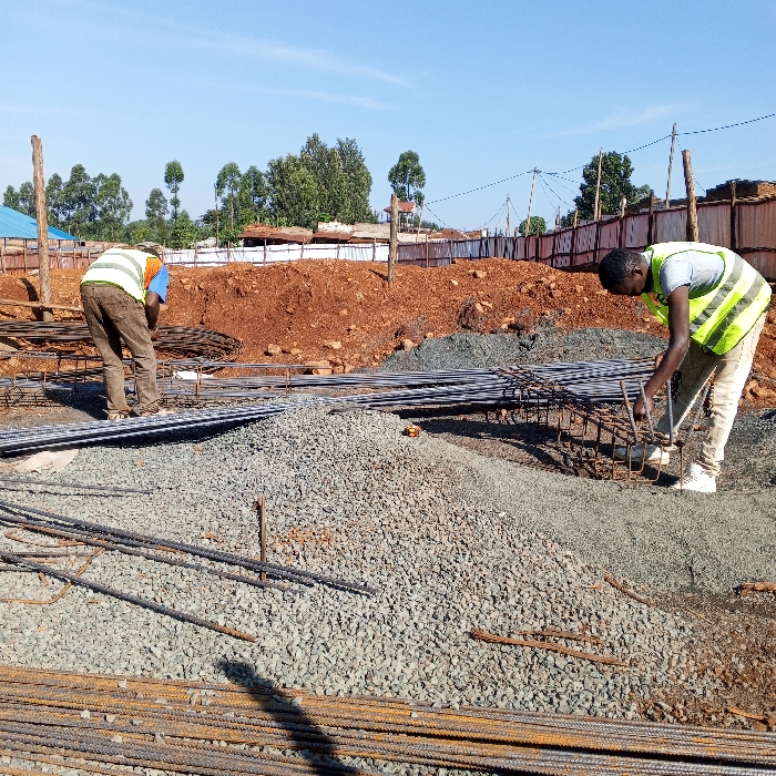 This image depicts an active construction site in Borabu Chitago ward, Kenya, under a clear blue sky