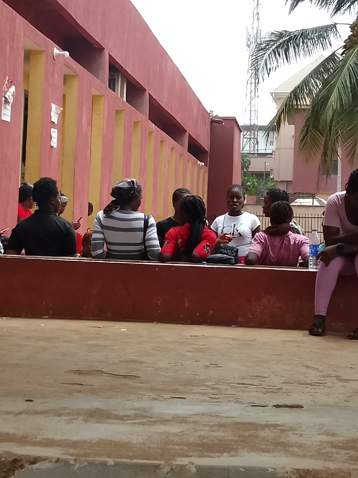 An outdoor scene in Umuokpu, Nigeria, depicts a group of approximately nine individuals gathered in front of a building. The dominant structure on the left is a two-story building featuring reddish-brown upper walls and lower sections with prominent vertical yellow columns or panels. Several white papers are affixed to the reddish-brown wall. An air conditioning unit is visible in an upper window recess, along with white light fixtures mounted on the wall. In the midground, a low, reddish-brown concrete barrier or seating area extends horizontally across the frame. Behind this barrier, a group of people, primarily young adults, are positioned. From left to right: one person in a red top is partially obscured; one individual in a black shirt faces away from the viewer; one person wears a grey and white striped shirt and a patterned head covering, facing away; one person in a dark shirt is partially obscured; one person in a red t-shirt with black designs faces away, with a black bag and a blue bottle nearby; a central figure in a white "CK" branded t-shirt faces right, appearing to speak; two individuals in light pink tops are partially visible behind the speaker; and on the far right, one person in a light pink long-sleeved top and matching leggings is seated on the barrier, with a blue plastic water bottle next to them and black sandals on their feet. The foreground consists of a light brown, uneven concrete or dirt surface. In the background, to the right of the building, a tall metal lattice communication tower is visible against a bright, overcast sky. Portions of another building with a light-colored roof and walls, and green palm fronds from a tree, are also present. The scene is illuminated by natural daylight.