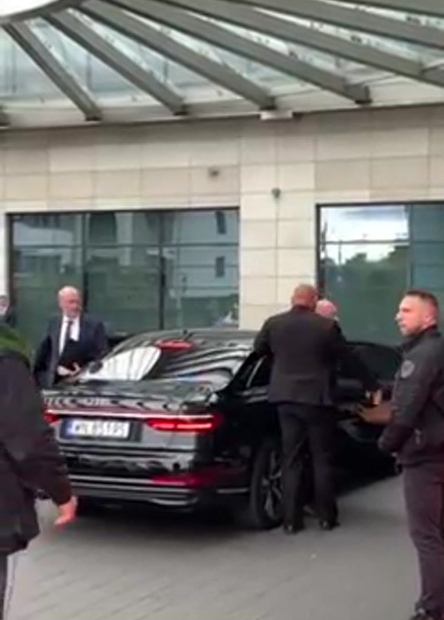 black Audi sedan with a Polish license plate parked under a modern glass and steel awning in front of a building with a red carpet leading to the entrance. A man in a suit gets out of the car, assisted by a security guard in a black jacket. Other security personnel stand nearby. A white SUV is parked next to the Audi. A woman in a black coat walks past the SUV. Further back, out of focus, there are several military vehicles and Polish police cars. A man in a tan uniform and hat stands on the red carpet. Another man in a blue jacket with a backpack walks on the red carpet. The video appears to have been taken outdoors during daylight on an overcast day. The wind is blowing.