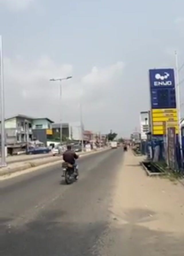 A long, straight paved road with some cracks is shown in a bright, daytime, outdoor shot. The sky is slightly overcast. On the right side of the road is an Enyo gas station sign. The price displays are all set to 888.88. A dirt shoulder runs alongside the paved road. In the background are various low-rise buildings and trees. Several vehicles pass along the road including cars, motorcycles and a yellow tricycle (tuk-tuk). A motorcycle sits in the lower left corner of the frame. Overhead are streetlights.