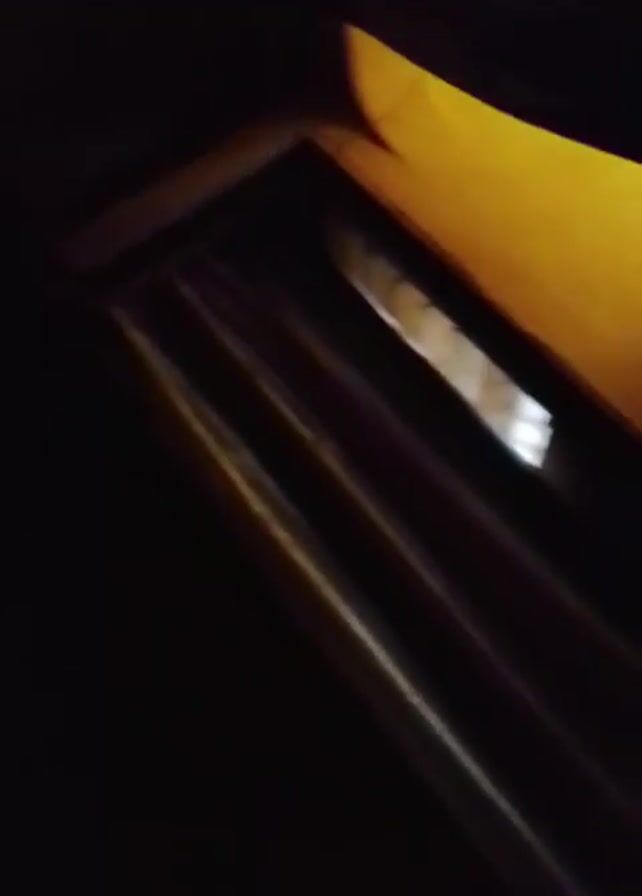 dimly lit interior with a few visible objects. There are what appear to be wooden planks or bars, likely part of furniture or a structure. A yellow object is also visible, but its identity is unclear. The camera seems to be moving slightly, causing some blur in the footage. The overall environment is dark and indistinct.