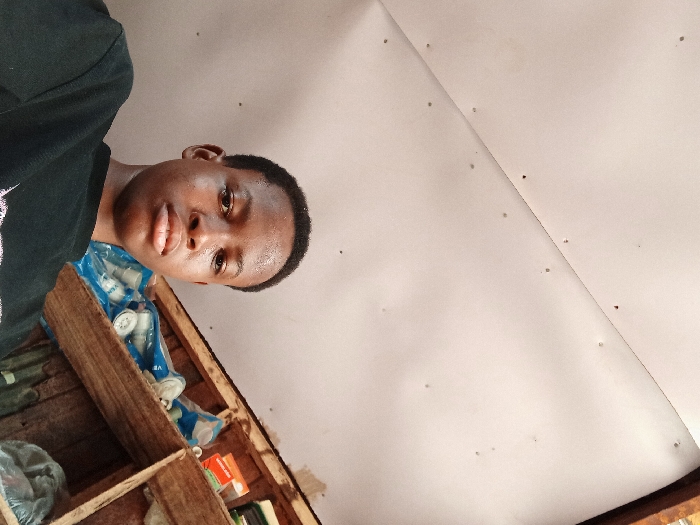 A young man with short dark hair and a dark t-shirt appears in the left side of the frame. He is gazing directly at the camera. Behind him, a wooden shelf is stocked with items, including blue and white packaged goods. The background consists of a white ceiling with multiple small, dark marks scattered across its surface. The overall perspective is angled upwards, giving a unique view of the subject and his surroundings.