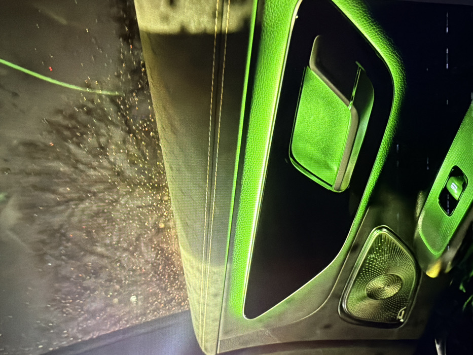 The image captures a detailed interior view of a modern vehicle, focusing on a front door panel and the exterior environment through its window
