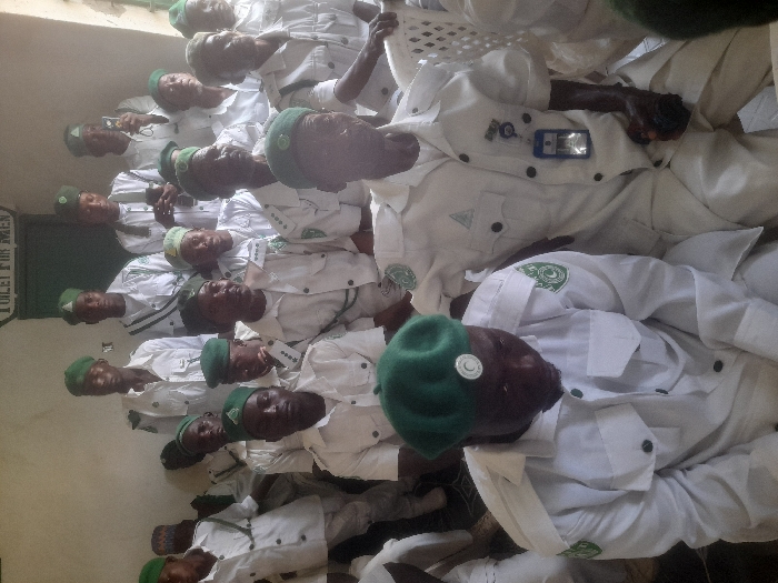 A group of men in white uniforms and green berets sit or stand in rows. The uniforms are buttoned and feature emblems. Some individuals have lanyards with devices attached. The setting appears to be indoors. A sign reading "TOILET FOR MEN" is visible on the wall. The photo is taken at an angle, presenting a crowded view of the group.