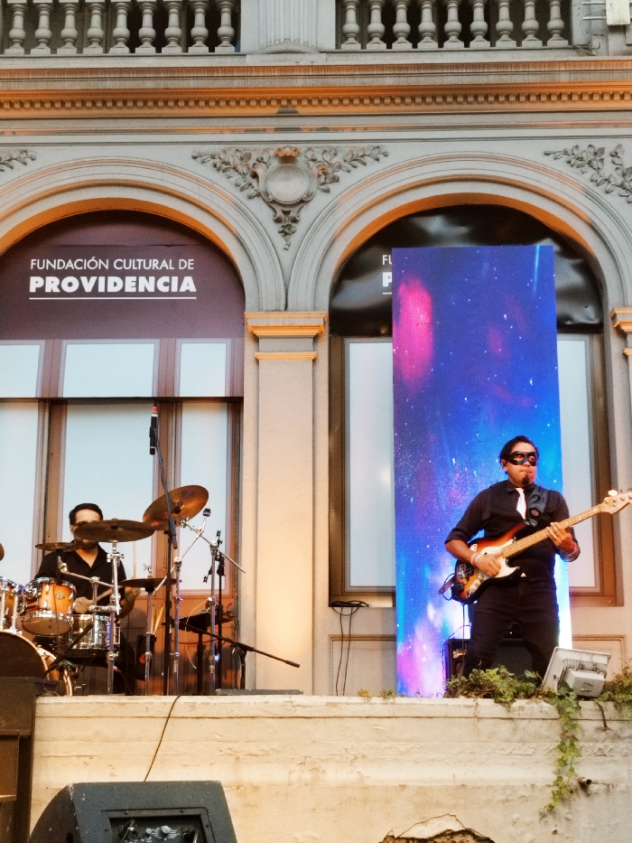 The image depicts a live musical performance on a raised stage at the Fundación Cultural de Providencia in Providencia, Chile