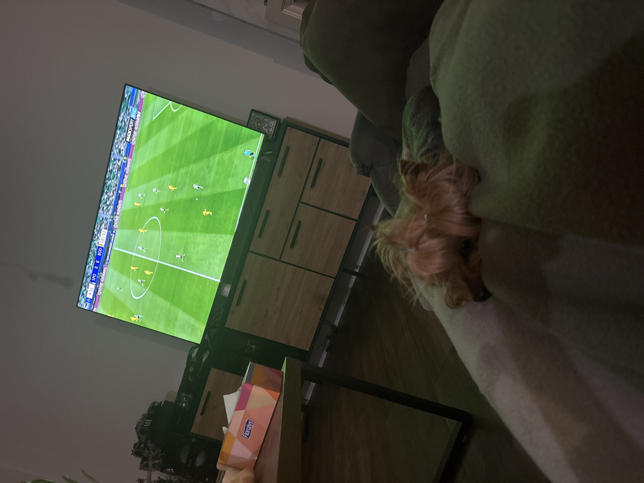 The image depicts an indoor scene within a residence in Topolovo, Bulgaria, captured from a low perspective, likely from a reclining position. In the immediate foreground, a small, light-brown dog, possibly a Yorkshire Terrier, is observed lying on a lap beneath a light-colored blanket. The dog's head is visible, with its hair partially gathered and secured by a light-colored accessory. In the mid-ground, a dark-colored coffee table holds a rectangular box of "Floraly's" brand tissues. Behind the coffee table, a large flat-screen television dominates the background, displaying a video game depicting a soccer (football) match. The score reads "SPO 0 - 0 BOD" with a game clock at "9:51." The virtual soccer field is green with white markings, featuring numerous player avatars in yellow and white/green uniforms. The television is positioned above a multi-sectioned media console or cabinet constructed from wood with dark framing. To the left of the television, a dark speaker and green plants are visible. The room is dimly lit, with the television screen providing the primary light source, casting a subtle greenish hue on the surroundings.