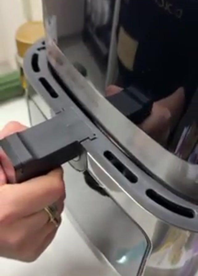 A person is using a silver and black air fryer