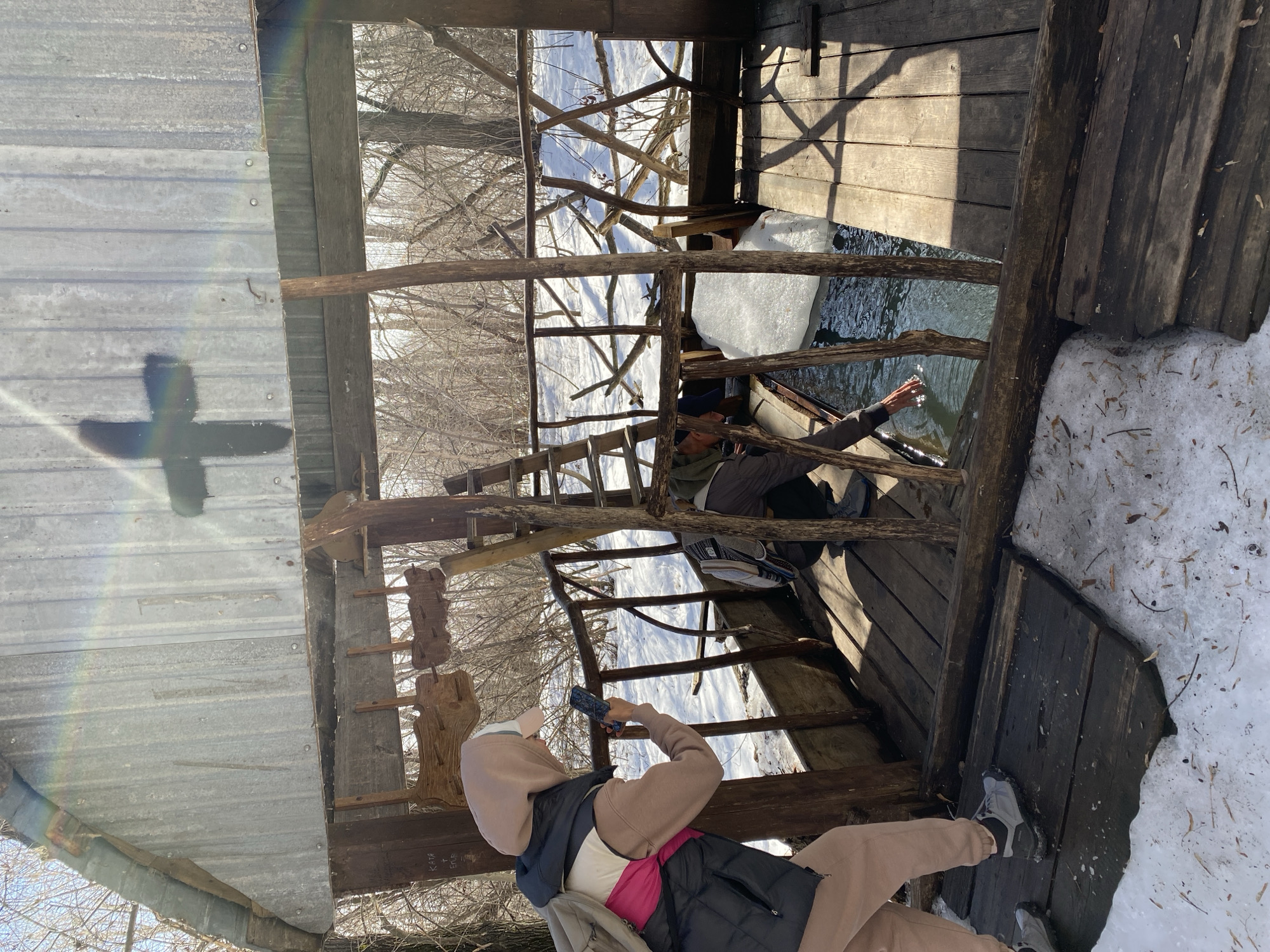 A woman is standing inside a rustic wooden structure, possibly a pavilion or small building, with a metal roof overhead. She is holding a phone in her hands, likely taking a photo or video. The structure overlooks a body of water with ice patches and a second person is inside a boat, touching the water with their hand. Bare trees and snow-covered ground are visible in the background. The location is Ulyanovsk, Russia.