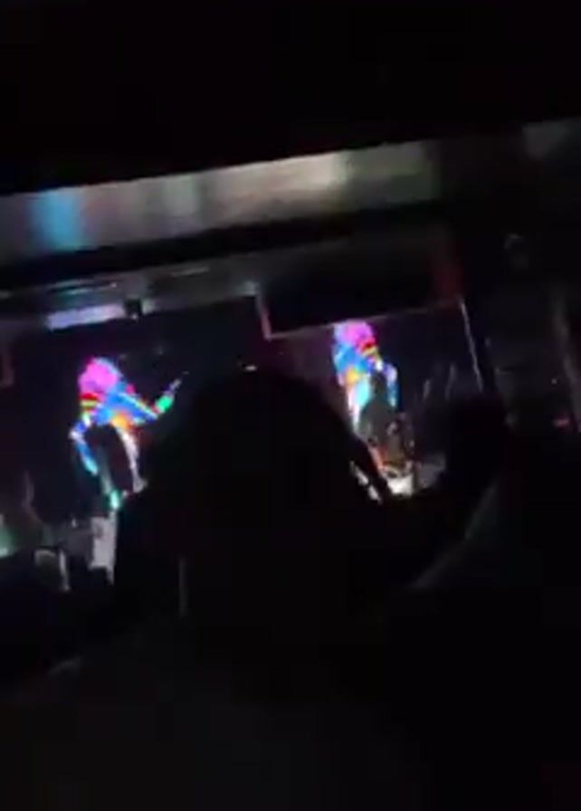 Two bald men are in what appears to be a nightclub or restaurant with modern green and multicolored lighting. One man is wearing a green t-shirt and smiling at the camera as he holds it up. The other man is also wearing a green t-shirt and raises both arms at the camera. The camera is moved around while looking up at the lights. Music is playing.