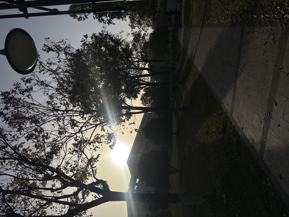 A low-angle shot captures trees silhouetted against a bright, hazy sky. A building is partially visible behind the trees, its windows glinting. To the right, a textured walkway extends into the distance. A street lamp is visible on the left. Light flares through the branches and leaves. The overall scene evokes a sense of early morning or late afternoon tranquility.