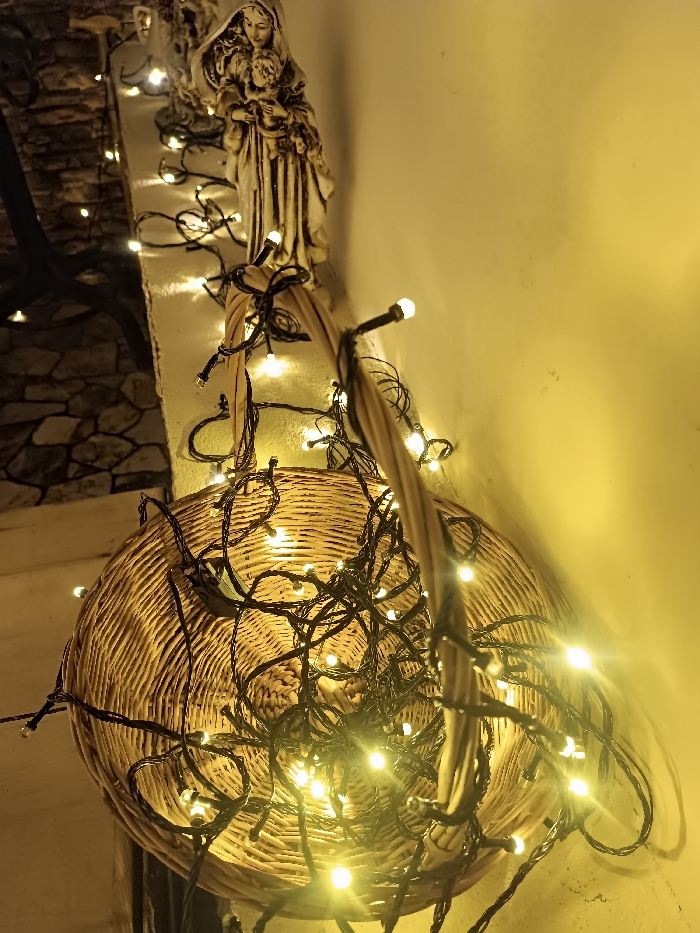 A wicker basket is the focal point, overflowing with string lights. The lights, with black wires, are densely packed, creating a warm glow. Above, a statue of the Virgin Mary holding a child overlooks the basket. The arrangement is set against a background of a beige wall on the right and a stone wall with greenery on the left.