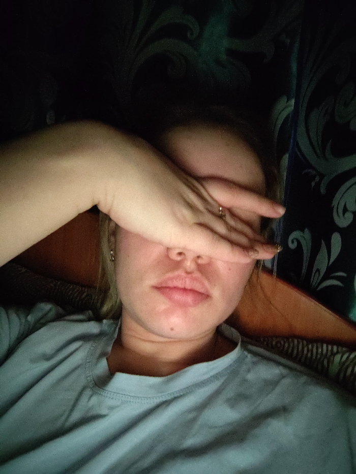 A woman is lying down, face partially covered by her left hand. A ring is visible on her ring finger. She wears a blue-gray t-shirt. Her skin tone appears fair. Part of a patterned headboard or wall is behind her. The lighting in the room is dim, casting shadows and making details difficult to discern.