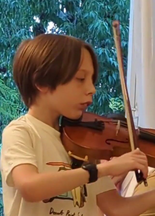 - "A young boy with brown hair and wearing a white t-shirt stands, playing a brown violin" by FM-vrtZw1, licensed under CC BY 4.0