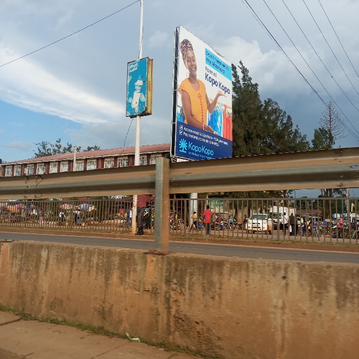 The image displays an active street scene in Sheywe ward, Kenya. In the foreground, a concrete barrier approximately 1 meter high is topped by a metal guardrail, separating the viewer's immediate perspective from the street. Beyond the guardrail, a paved road is visible. Numerous individuals are present on the far side of the road, engaged in various activities. Groups of motorcycles, identified as boda-bodas, are parked along the roadside, with riders and pedestrians standing near them. A white sedan or SUV is also parked further down the street. Alongside the road, market structures or vendor stalls are discernible, indicating commercial activity. People are walking, standing, and interacting within this area, with some figures partially obscured. In the background, a two-story building with a red-tiled roof and multiple windows lines the left side of the frame. To the right of this building, a prominent billboard features a smiling woman in a yellow garment holding clothing items, advertising "Kopo Kopo" services. Text on the billboard includes "Don't mess with my shukuru" and details about access to credit. Adjacent to this, a smaller, faded blue billboard depicting a bottled water product is mounted on a utility pole. Green trees and foliage are visible behind the billboards and buildings. Utility lines crisscross the sky, which is partly cloudy with patches of blue and darker grey. The scene is illuminated by daylight.