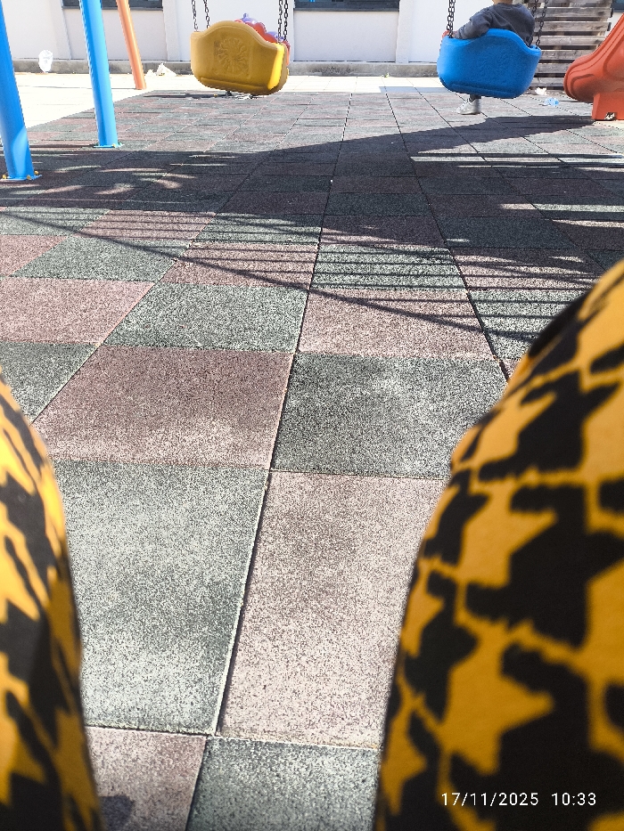 The image displays a brightly lit playground in Nicosia, Northern Cyprus / Cyprus, from a first-person perspective, looking down between the photographer's legs, which are clad in yellow trousers with a black geometric pattern. The ground is covered with square rubber safety tiles in alternating shades of grey, pinkish-brown, and dark green/black. Long, parallel shadows are cast across the surface from playground structures, indicating direct sunlight. Visible playground equipment includes blue and orange vertical support poles. A yellow, unoccupied swing seat hangs on chains. To the right, a blue swing seat is occupied by an individual, visible from the back, wearing a dark top and light-colored shoes. A red plastic slide or play structure is partially visible on the far right. In the background, a white building with dark-framed windows is present, behind a concrete path and a wooden fence. The timestamp indicates the image was captured on 17/11/2025 at 10:33.