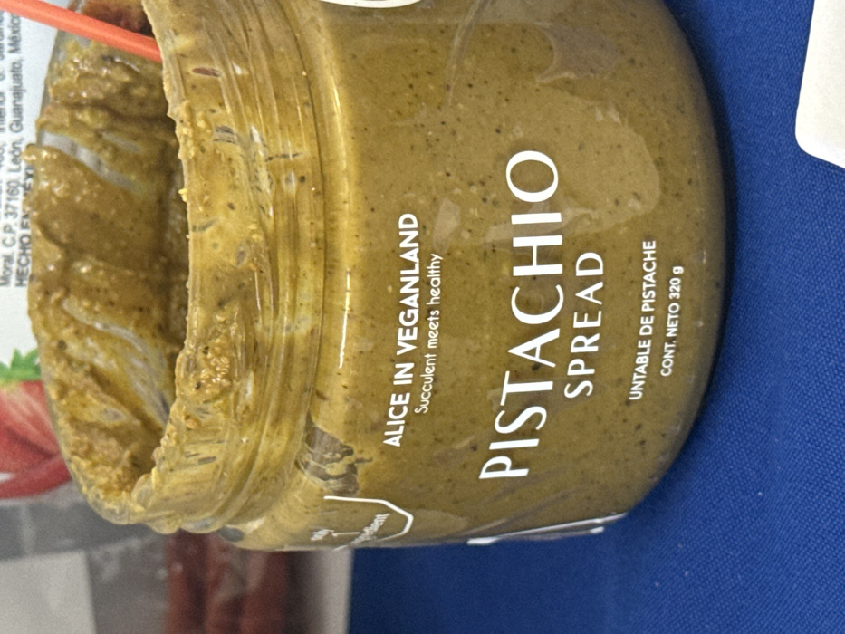A partially consumed jar of pistachio spread, produced by Alice in Veganland, is shown. The label indicates that the product is a spread and is intended to be succulent and healthy. The label also includes the phrase "UNTABLE DE PISTACHE" and a net weight of 320 grams. A spoon or other utensil appears to be in the open jar. Information, including "Moral. C.P. 37160. León, Guanajuato, México", is partially visible on the jar's labeling. A blue surface is visible under the spread.