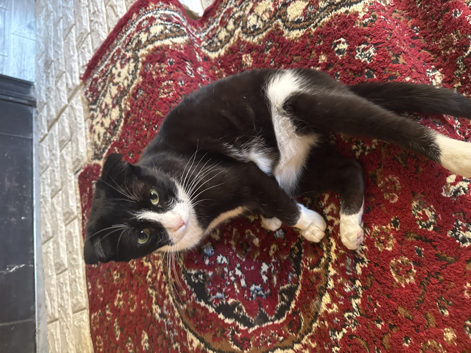 - "A black and white cat lies on a patterned red and beige rug" by FM-7p9nD3, licensed under CC BY 4.0