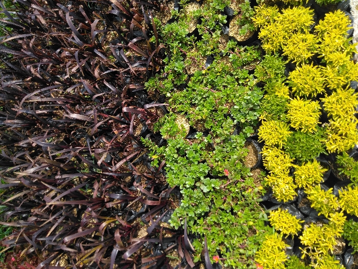 The image depicts an outdoor horticultural scene in Dulce Nombre de Jesús, Costa Rica, featuring multiple rows of potted ornamental plants. The top section displays a dense arrangement of dark reddish-brown, strap-leafed plants, individually contained in black plastic nursery bags. Directly below, a middle section consists of smaller, vibrant green, broad-leafed plants, some exhibiting small red flowers, similarly potted in black plastic bags with visible soil. The bottom section presents a uniform grouping of bright yellow-green, fine-leafed bushy plants, also individually potted in black plastic nursery bags. All plants are static, arranged in distinct horizontal bands, suggesting a nursery or garden center setting under natural light. No individuals are present in the frame, and no specific actions or interactions are occurring.