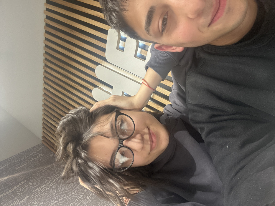 The image displays two young individuals within a Hesburger restaurant, likely located in Panorama Mall, Pleven, Bulgaria. A female subject, positioned on the left, has dark, wavy hair, wears dark-rimmed glasses, and a dark grey long-sleeved top. Her left hand is raised towards her head; a red string bracelet is visible on her left wrist. She displays a faint smile, looking upwards and to the right. A male subject, partially visible on the right, wears a dark long-sleeved sweatshirt and exhibits a faint smile, looking towards the camera. The background on the left features a dark wall adorned with white text forming a word cloud, including the brand name "HESBURGER" and various Finnish city names. To the right, a wall clad in vertical light-colored wooden slats displays a large, white, three-dimensional "HES" logo, with the 'H' and part of the 'E' clearly visible. The lighting is consistent with an indoor, artificially lit commercial establishment.
