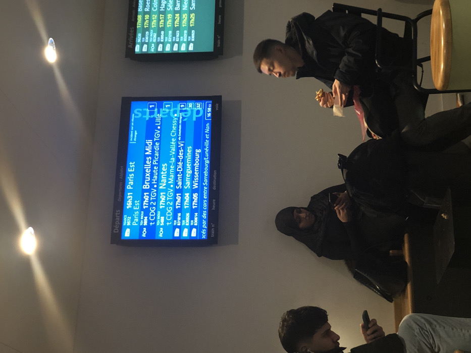 In a waiting area, three people are present. One man sits on a chair, eating, while another man is seated and looking at his phone. A woman in a hijab sits, also using her phone. Above them are electronic boards displaying train departure information. The signs list destinations like Paris Est, Bruxelles Midi, and Nantes, with corresponding departure times. Another board above lists train arrivals, including destinations like Basel, Colmar, and Barr.