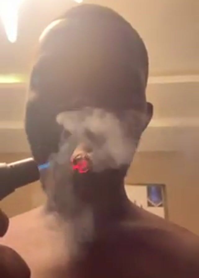 A shirtless man with dark skin and a beard is lighting a cigar with a torch lighter. The end of the cigar glows red, and smoke billows out. A ceiling light and a framed image on the wall are visible in the background.