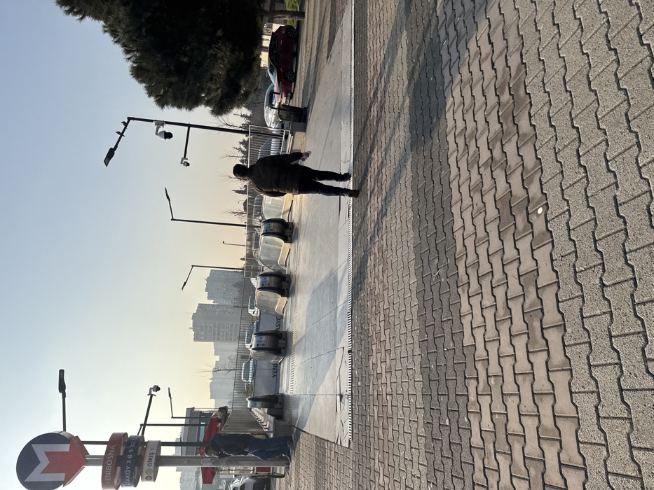 This image depicts an outdoor scene at an Istanbul Metro station entrance in Bakırköy, Turkey. The time of day appears to be late afternoon or early morning, indicated by long shadows cast across the foreground and a low sun angle. In the foreground, the ground is paved with interlocking concrete pavers in light and dark grey shades. This transitions to a smoother, lighter grey concrete surface with linear drainage grates directly in front of the metro entrance. The metro entrance features four parallel escalator units, recessed into the ground. The two units on the far left appear operational, descending. The two units on the right are static, with their steps flush with the ground level. Signage on the metal panels above the escalators includes partial text, "YENİ" and "ASYC". A low metal railing separates the escalator area from a vehicle area behind. To the left of the escalators, a tall pole supports Istanbul Metro signage: a red "M" logo at the top, followed by a red rectangular sign reading "YENİBOSNA", a blue rectangular sign reading "BAKIRKÖY 7-8-9-10", and a green rectangular sign with "GİRİŞ 1" (Entrance 1). Adjacent to the pole, a male individual in a dark jacket, blue jeans, and dark shoes stands, leaning against a low structure, holding a mobile phone to his left ear. A partial view of a white vehicle and a red umbrella structure is visible behind him. To the right, another male individual, dressed in a dark puffer jacket, dark trousers, and dark shoes, walks away from the viewer, towards the escalator area. He carries a white object in his right hand. Further to the right, a large dark green coniferous tree is visible, along with two parked vehicles, a red sedan and a dark-colored sedan. The background reveals an urban skyline under a clear, bright sky, with multiple multi-story buildings visible on the horizon, partially obscured by atmospheric haze. Several black streetlights with LED fixtures and multiple CCTV cameras are mounted on poles throughout the scene, indicating security and illumination infrastructure.