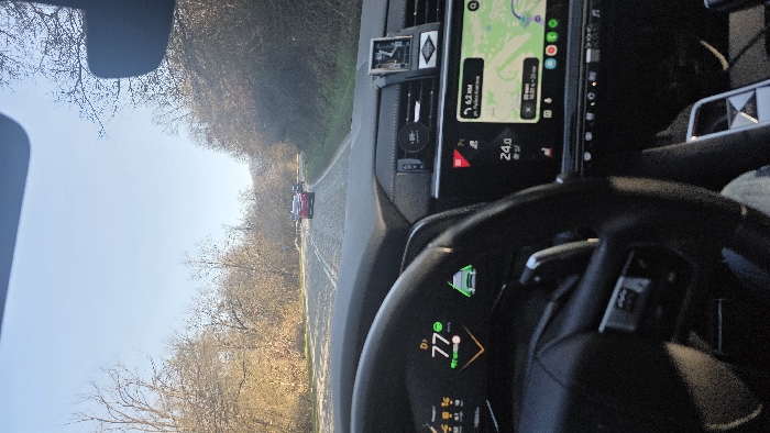 The image captures a driver's perspective from within a vehicle on a rural road, identified as being in the city of Zaia, Bulgaria, with a navigation route displaying "ул. Прохода Воденица" as a destination 6.2 km away. In the immediate foreground, the top of a dark-colored steering wheel is visible on the left, partially obscuring a digital instrument cluster. This cluster displays a speed of 77 km/h, the gear selection "D" for drive, and active lane-keeping assistance indicators, including a green outline of a vehicle ahead. To the right, a central infotainment screen displays a navigation map, indicating the ambient temperature at 24.0 degrees Celsius and an estimated arrival time of 16:21 with an additional 20 minutes. A decorative, clock-like object is mounted on the dashboard near the passenger air vent. A small segment of the driver's leg, clad in blue jeans, is visible at the bottom center. Through the windshield, a two-lane asphalt road with visible white lane markings extends forward, curving gently to the right. A red car, possibly an SUV, is observed in the same lane ahead, followed by at least one additional darker vehicle. Both sides of the road are lined with a dense growth of deciduous trees, largely bare of leaves, suggesting a cold-weather season. The sky above is clear and light blue, indicating daylight conditions with sunlight appearing to originate from the left. Distant hills or mountains are faintly visible on the horizon.