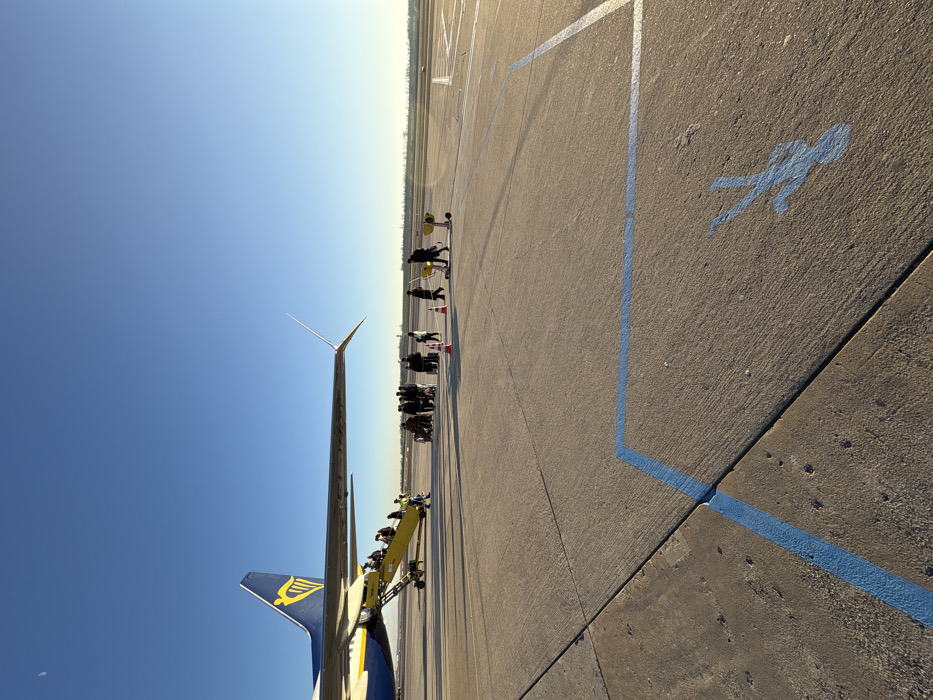 The scene depicts an active airport tarmac under a clear blue sky with a visible crescent moon. A Ryanair Boeing 737-800 aircraft (registration EI-DPC) with blue and yellow livery is parked on the concrete surface at Vienna International Airport in Schwechat, Austria. A yellow mobile boarding stair unit is positioned at the rear passenger door of the aircraft, with multiple individuals, approximately 5-7, ascending the stairs. On the tarmac, a group of approximately 10-15 passengers, some with luggage, is gathered near the aircraft, seemingly queuing to board or having recently disembarked. Two individuals are operating or moving yellow airport ground service equipment, possibly luggage carts, away from the passenger group. Two orange traffic cones are placed between the aircraft and the ground service equipment. The concrete tarmac in the foreground features distinct blue painted lines forming a partial rectangular perimeter and a blue stylized human figure indicating a pedestrian area. Shadows from the aircraft and people are cast towards the right, suggesting the sun is low and to the left. The distant background shows a flat horizon with indistinct airport infrastructure and a clear runway or taxiway.