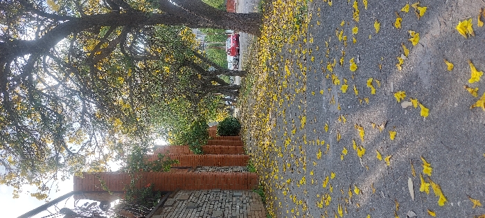 A pathway is covered with scattered yellow flowers, leading into a row of trees overhead