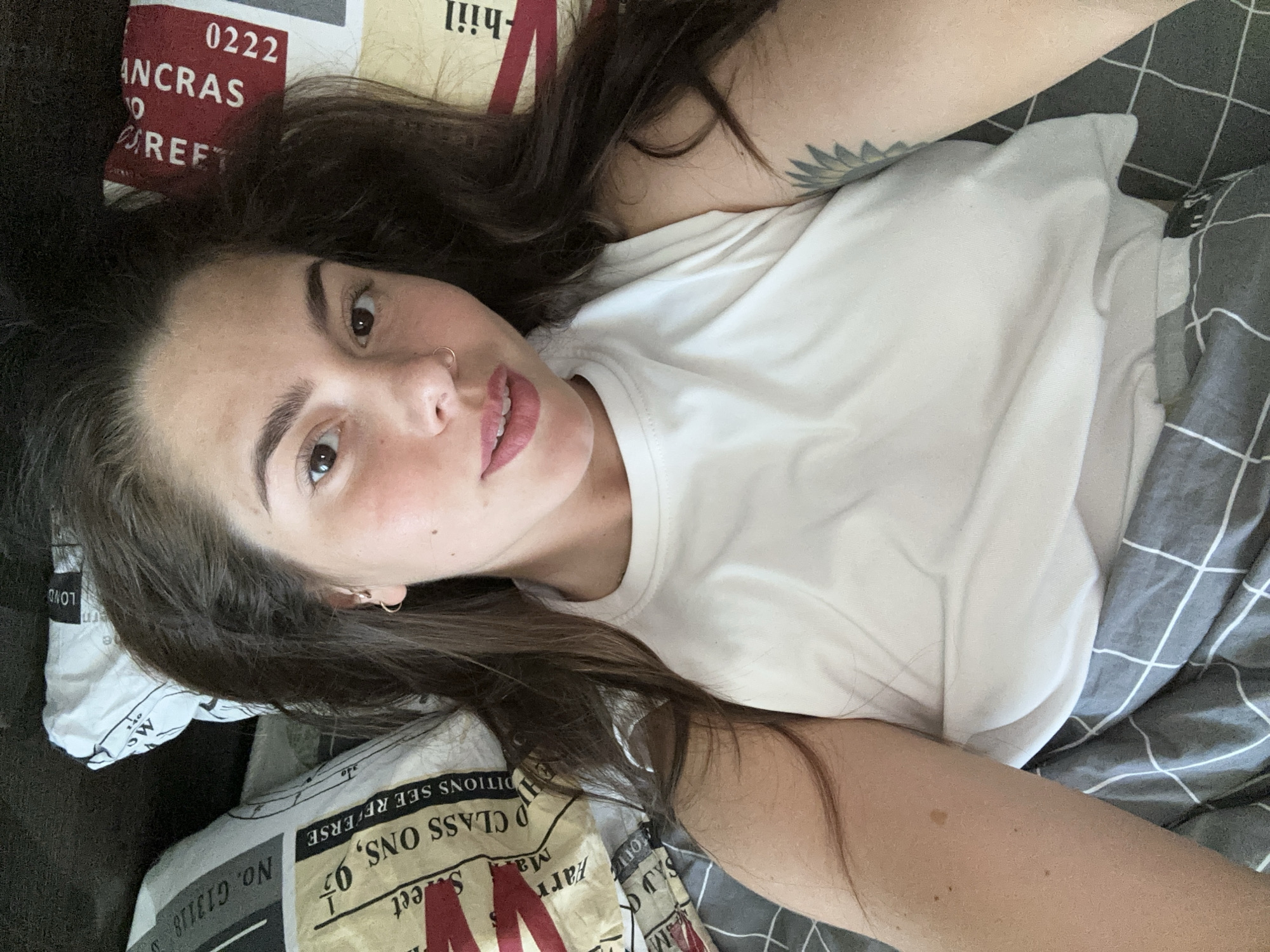 A young woman lies on a bed. She wears a white t-shirt. A tattoo is visible on her left arm. Her head rests on a pillow printed with text. A gray and white plaid blanket covers part of her body. The text on the pillow is partially readable and includes street names like "ANCRAS STREET." The city of Reutov, Russia, is not discernible in the image.