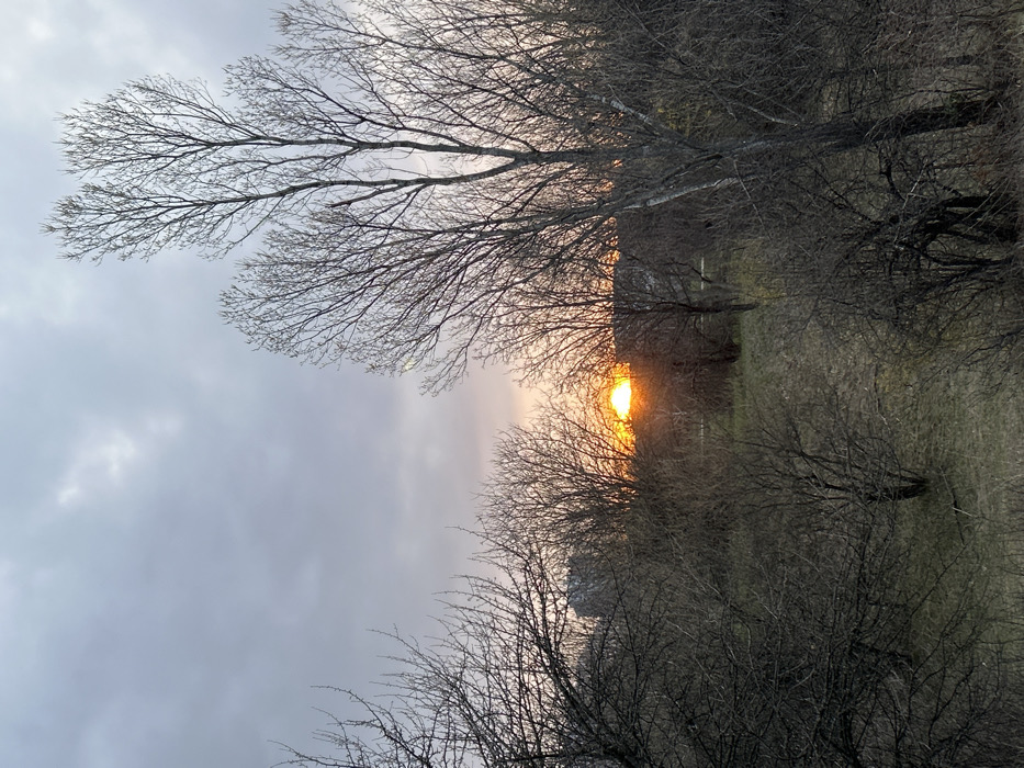 The image displays an outdoor scene in Sofia, Bulgaria, at either sunrise or sunset. The sky is mostly overcast with light grey clouds, transitioning to a light orange hue near the horizon where a prominent, half-visible orange sun disc is positioned. The foreground and midground are densely populated with a variety of bare deciduous trees and shrubs, indicating a dormant season. Sparse green and brown vegetation covers the ground beneath the trees. In the distant background, several multi-story urban buildings are faintly visible, silhouetted against the horizon. No individuals, animals, or specific human activities are present in the observable scene.
