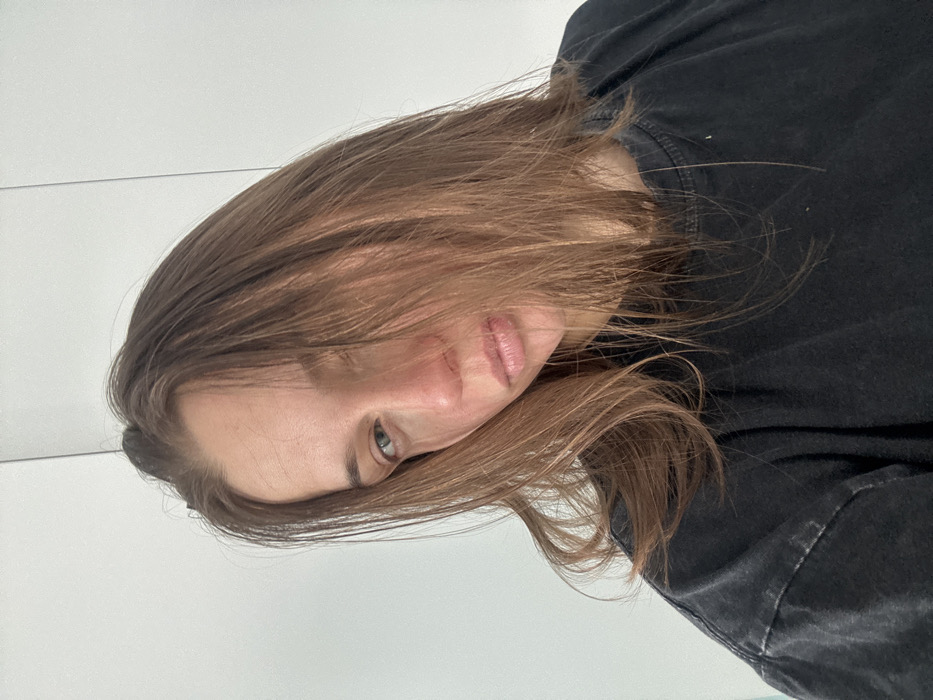 A head-and-shoulders portrait depicts an adult female positioned slightly left of center in an indoor setting. Her light brown hair is disheveled, partially covering the right side of her face. Her visible left eye appears light in color. Her facial expression is neutral, with lips slightly parted. Redness is visible around her nose and beneath her left eye. She wears a dark, possibly faded black, short-sleeved t-shirt, exhibiting some visible lint or fabric wear. The background consists of a plain white wall with subtle vertical paneling lines. The location is an interior room in Unknown, Unknown.