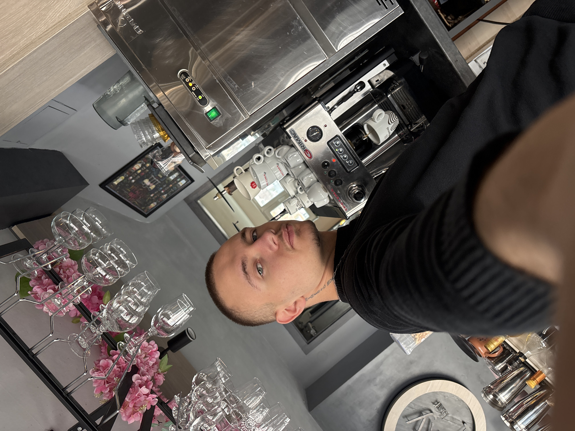 This image depicts the interior of a commercial establishment, specifically the PERPERIK Coffee Bar located at ul. „Струма“ 37А, 1303 Център, Sofia, Bulgaria. In the foreground, a male individual is positioned, looking directly into the camera as if taking a selfie. He has short, light-colored hair, light eyes, and wears a dark, ribbed long-sleeved shirt. A faint chain or tattoo is visible on the left side of his neck. His right arm and hand are partially visible at the bottom right. The background reveals a working bar area. To the upper left, an overhead rack holds numerous clear, inverted wine and cocktail glasses. Pink artificial floral decorations are intertwined with the glass rack. A black ceiling-mounted light fixture is also visible. On the lower left, a circular wall decoration with a light wooden frame and dark abstract elements is mounted. Below it, on a dark countertop, are several stainless steel cocktail shakers and glass bottles, likely containing spirits. To the right, professional bar equipment is present. A stainless steel GRIMAC SPERIMA espresso machine is visible, with gauges and buttons, and a white ceramic espresso cup with a black wavy design is positioned to collect coffee. Above and to the left of the espresso machine, a stack of white espresso cups featuring a red "DE" logo is piled. Above the espresso machine, a larger stainless steel SPARTAN ICE MAKER is prominent, displaying indicator lights (green, yellow, red) and a green illuminated power switch. The machinery rests on a dark countertop. The wall behind the equipment is dark gray, and a framed picture of various bottles is mounted above the ice maker. A light-colored wooden structural element is visible at the top right of the frame. The overall environment suggests a clean, operational cafe or bar.