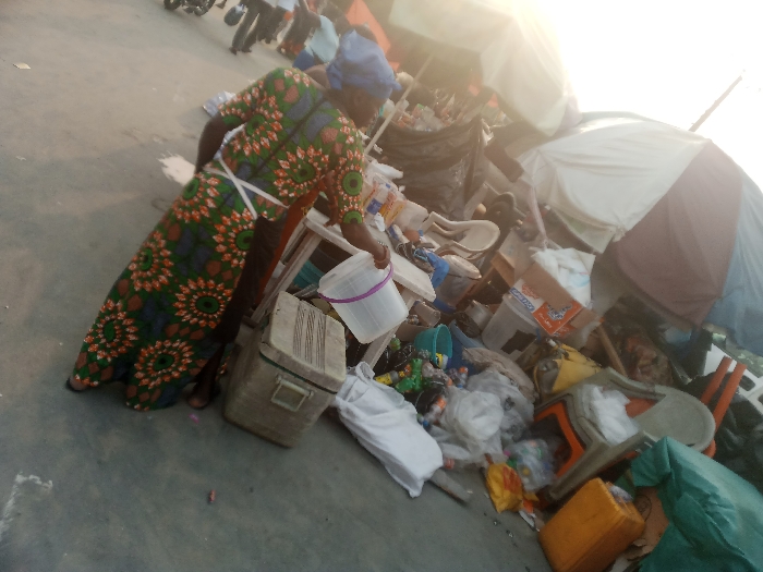 A woman in a vibrant floral dress and apron pours from a white bucket amidst cluttered surroundings. Various items including chairs, plastic containers, and a cooler are visible in a pile. An umbrella and possibly a vendor's stall are partially seen behind the clutter. The scene appears to be outdoors, potentially a market or roadside area, with other people and vehicles in the blurry background. The overall impression is one of activity and perhaps some disorganization.