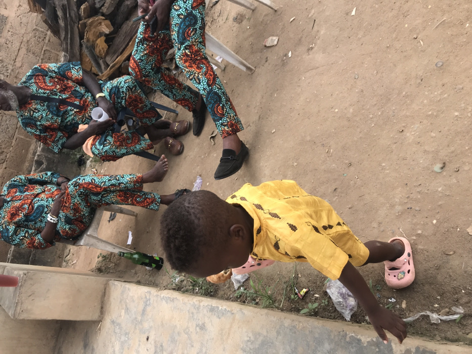 A young boy in a yellow shirt and pink Crocs crawls on the ground. Three people are visible wearing patterned clothing, one sitting on a chair and two resting. A green glass bottle lies on its side near a ledge. The setting appears to be outdoors, with a dirt ground and some scattered debris.
