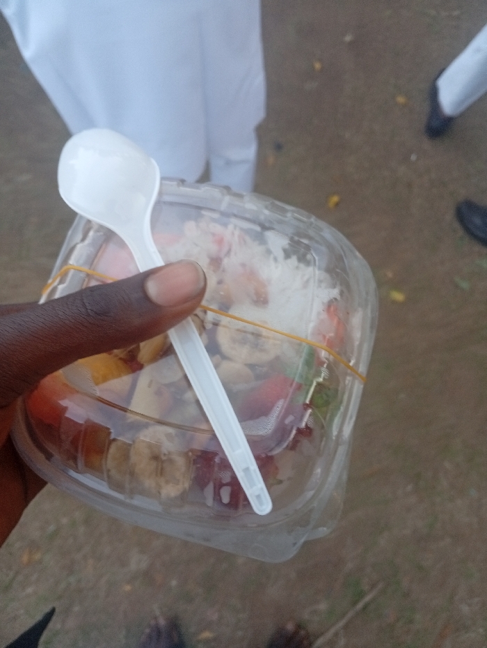 A person holds a clear plastic container filled with chopped fruit salad. Banana slices, red grapes, and other colorful fruits are visible. A white plastic spoon rests diagonally across the top of the salad. An elastic band secures the container lid. The person's dark-skinned hand grips the container. The background shows blurred ground and legs of people wearing white clothing.