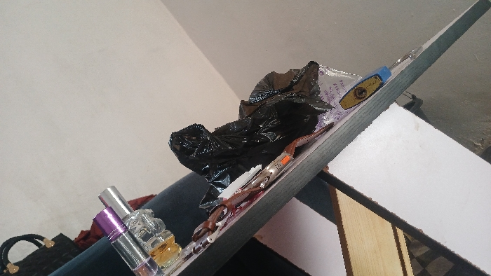A cluttered shelf displays a variety of items. There's a black bag, assorted cosmetics including perfume bottles, a brown belt with a buckle, and what appears to be a small lock with a blue handle. These items are arranged haphazardly on the shelf, suggesting a lack of organization. The shelf is positioned at an angle, creating a dynamic composition.
