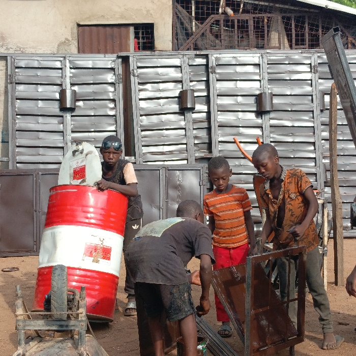 Four young boys are working in what appears to be a makeshift workshop or yard. One boy wears sunglasses and stands near a large red and white barrel with a container on top. Another wears an orange striped shirt, while a third wears a patterned orange shirt. The fourth is bent over, working on a metal frame. A metal gate stands in the background, and construction materials are scattered around. The scene evokes a sense of industriousness amid basic conditions.