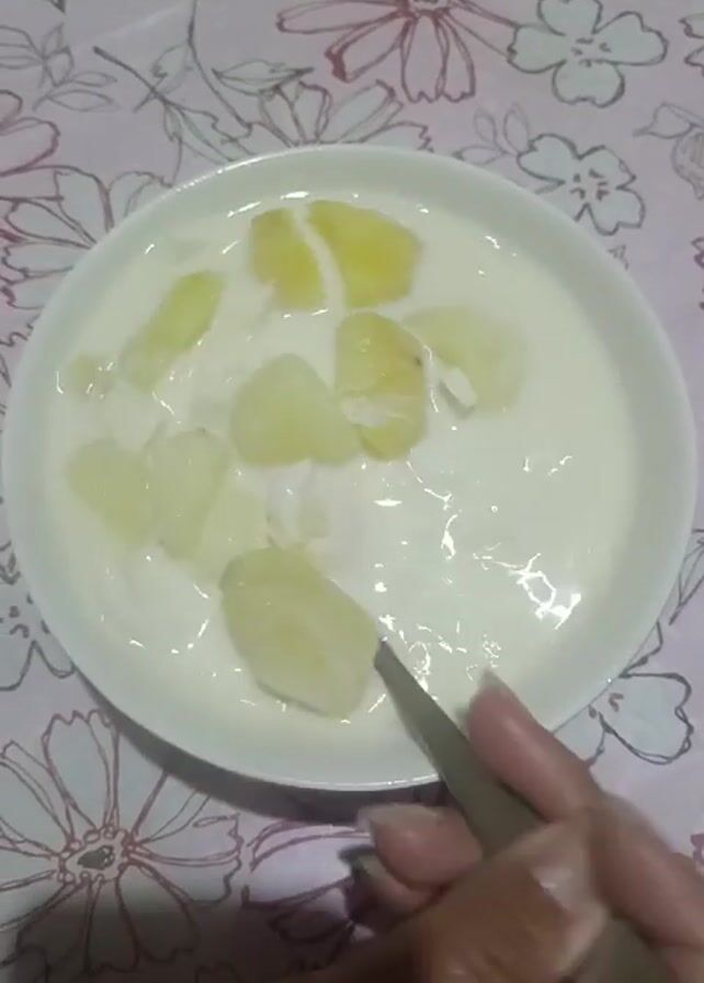 A hand stirs a bowl of white liquid with chunks of yellow fruit
