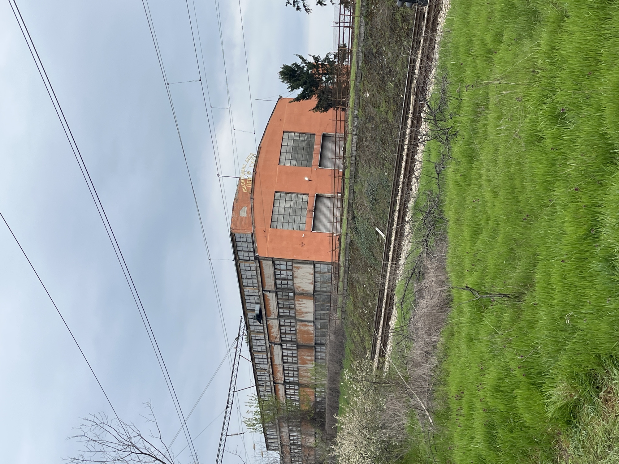 The image depicts a multi-story, orange-colored industrial building in Levski, Bulgaria. The building appears aged and possibly abandoned, with visible signs of disrepair on its facade. A set of railroad tracks runs alongside the building, separating it from a grassy field. Overhead power lines are visible against a cloudy sky. The environment is characterized by a mix of industrial decay and natural overgrowth.