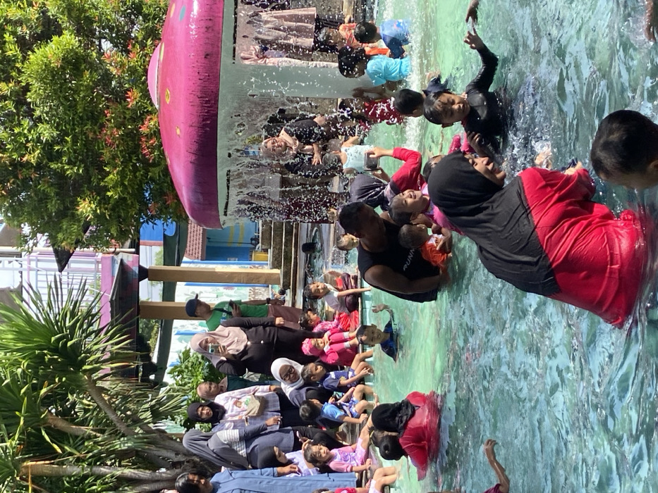 A large group of people, adults and children, are gathered at a water park. Some are standing along the edge of a pool, while others are in the water. A mushroom-shaped water feature is showering people with water. Many individuals are wearing headscarves. There is a lush green tree to the left of the image and structural supports visible on the edge of the park.
