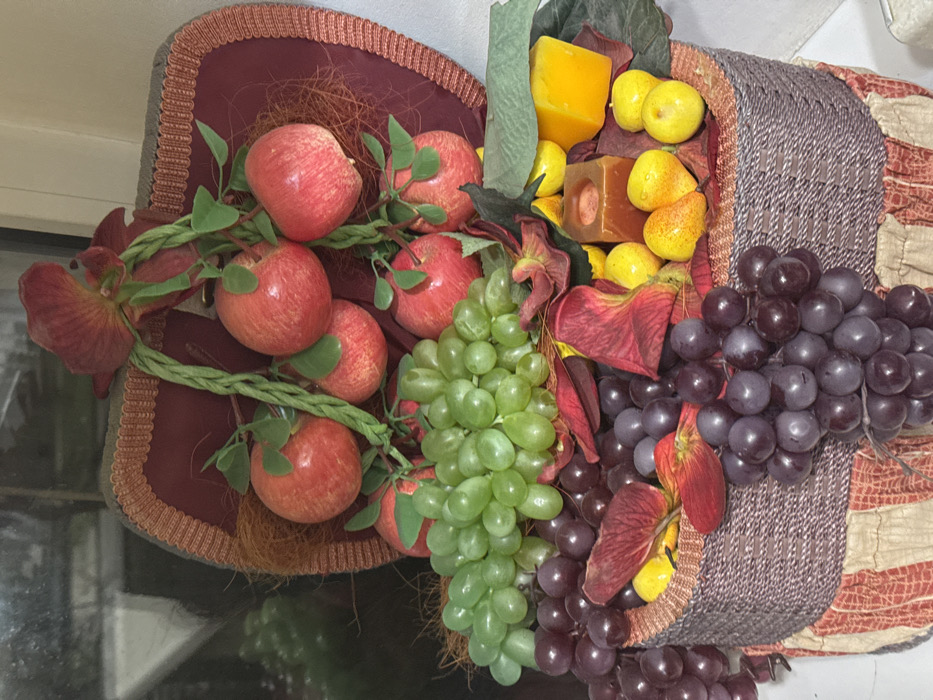 This image displays a decorative still life arrangement, located in the city of Armavir, Russia. The central subject is a two-tiered, open-top container resembling a picnic basket, replete with artificial fruits and embellishments. The upper tier of the container has a dark red interior framed by a woven brown-orange trim, and contains approximately ten artificial red apples, some of which are suspended by braided green cords with small green leaves. A substantial cluster of artificial light green grapes is situated within this tier, interspersed with reddish-brown fabric leaves. The lower tier consists of a cylindrical or oval basket with a woven purple-brown exterior, resting on a base covered in red and beige striped fabric. This section is filled with multiple bunches of artificial dark purple grapes, several small yellow fruit-like objects, a rectangular yellow block resembling cheese, and a square, reddish-brown object, likely a decorative candle or block. Additional reddish-brown fabric leaves and some green leaves are distributed among the items. The background is out of focus, revealing a dark, reflective surface on the left, possibly a window, and a lighter, non-reflective surface on the right side of the lower portion of the image. Faint reflections of green objects are discernible in the blurred background.