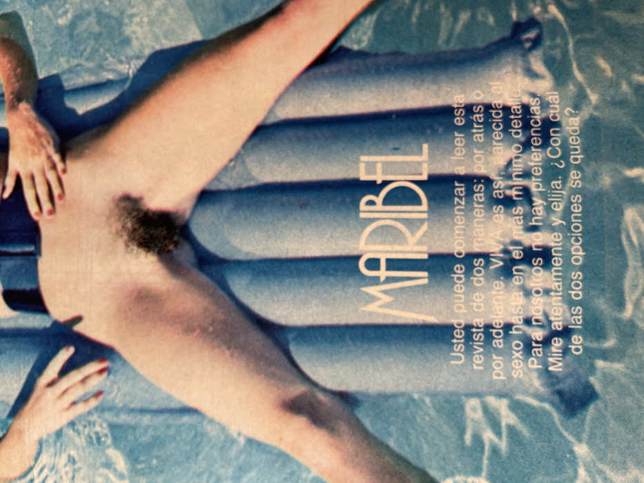 The image features a nude person with red nail polish on a blue inflatable pool raft. The person's legs are spread wide. To the right, the word "MARIBEL" is vertically displayed in large white letters. Next to the name, there is Spanish text, partially visible, that reads, "Usted puede comenzar a leer esta revista de dos maneras: por atrás o por adelante." It also says, "VIVA es así, parecida al sexo hasta en el más mínimo detalle." The text ends with, "¿Con cuál de las dos opciones se queda?"