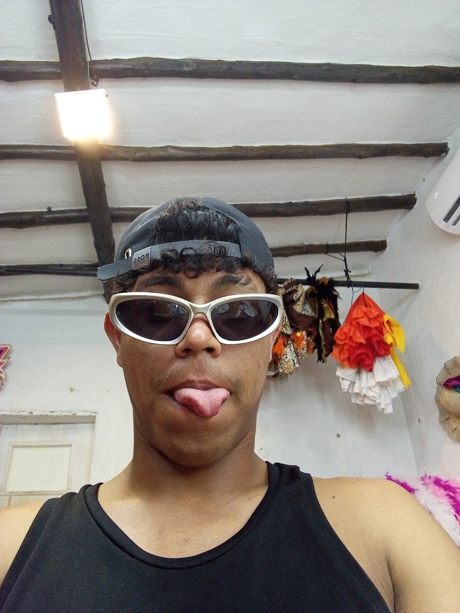 A man is indoors, sticking his tongue out. He is wearing a black tank top, a black baseball cap, and silver-rimmed sunglasses. Behind him, a white ceiling has dark wooden beams and a light fixture. He is standing in front of decorations in the city of Porlamar, Venezuela.
