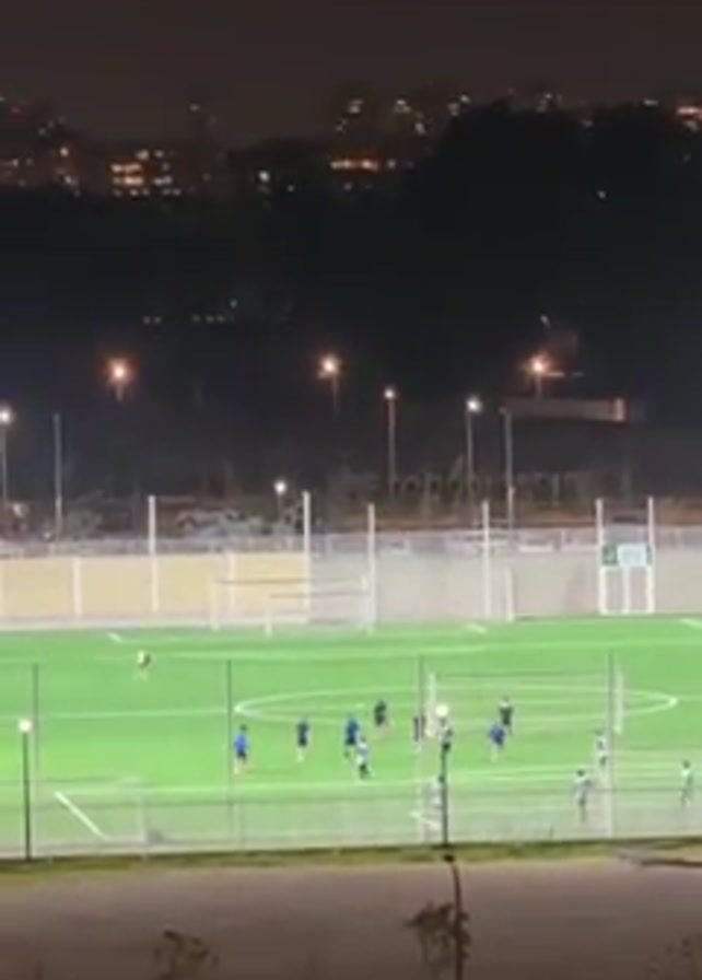 At night, a distant view shows a group of people training on a soccer field. The field is artificially lit, and is enclosed by a fence. The players are wearing blue and white uniforms. Behind the field, there are buildings and trees against the night sky. The camera zooms out slightly during the video.