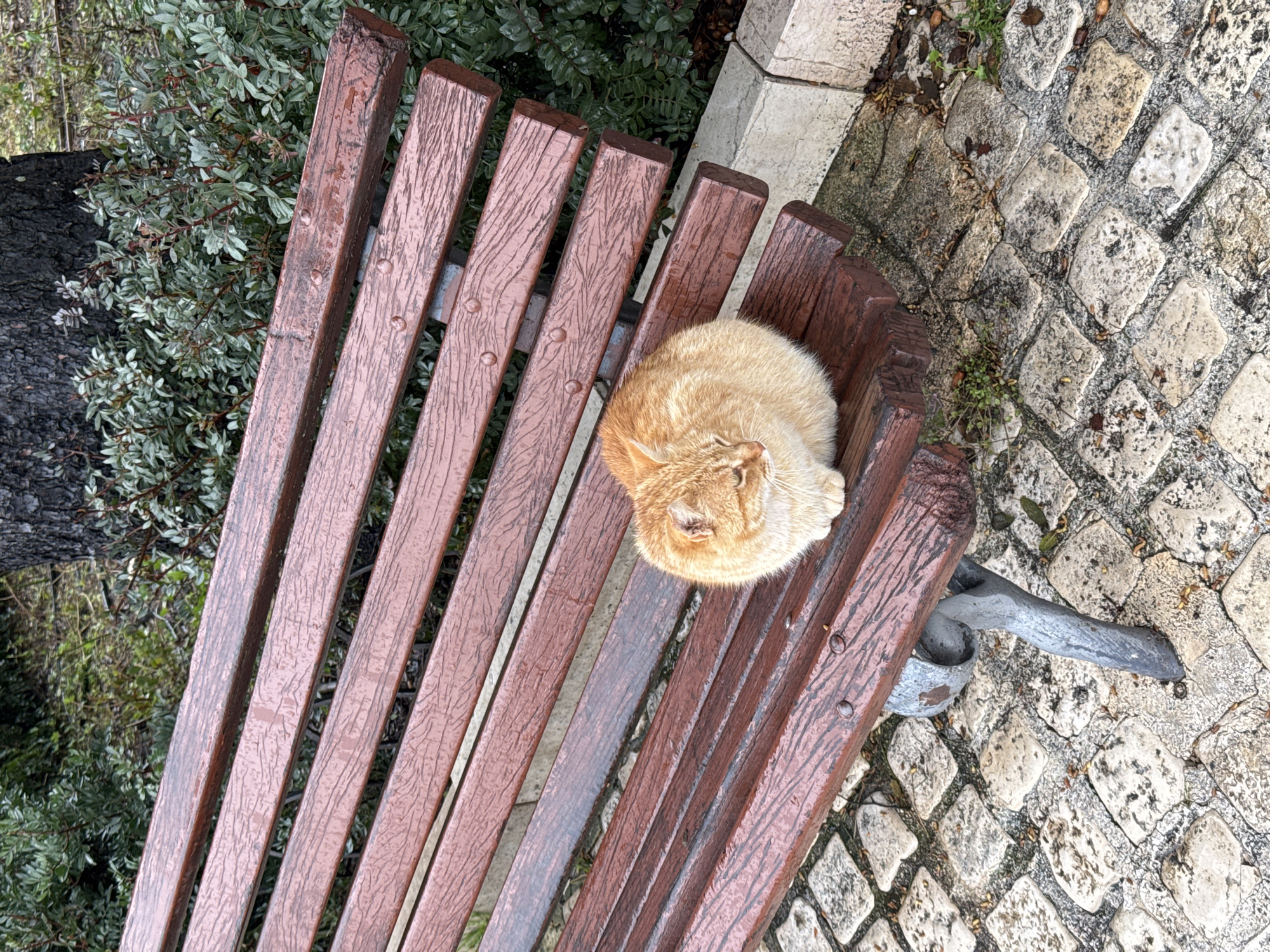 - "An orange tabby cat is curled up on the right side of a wet wooden park bench" by FM-gl8oi2, licensed under CC BY 4.0