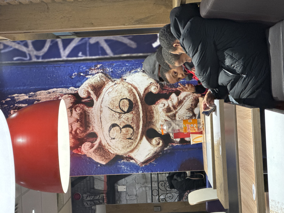 Two individuals huddle together, one looking at a phone and the other watching. A drink and a McDonald's container sit on the table beside them. Behind them is a large image of a stylized number "36," mounted on a blue background. The setting seems to be a casual restaurant or fast food establishment with a distinctive decorative element.